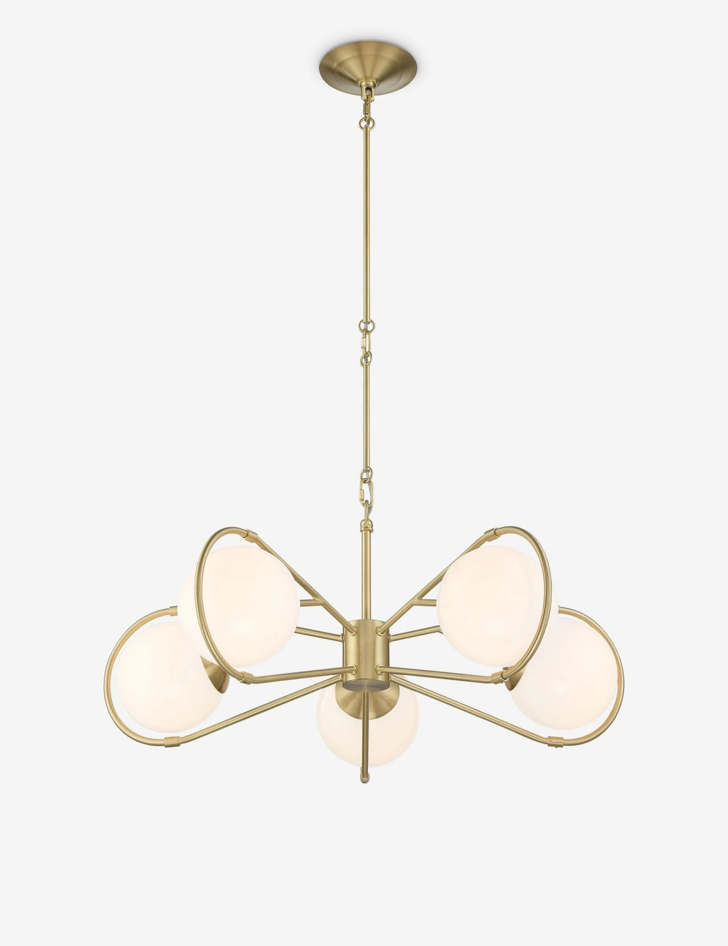 Create signature appeal overhead with this distinctive chandelier design. Five looping arms hold white glass globes, offering mid-century charm with a touch of glamour. This chandelier is the perfect size for most dining tables or a mid-sized lounge.