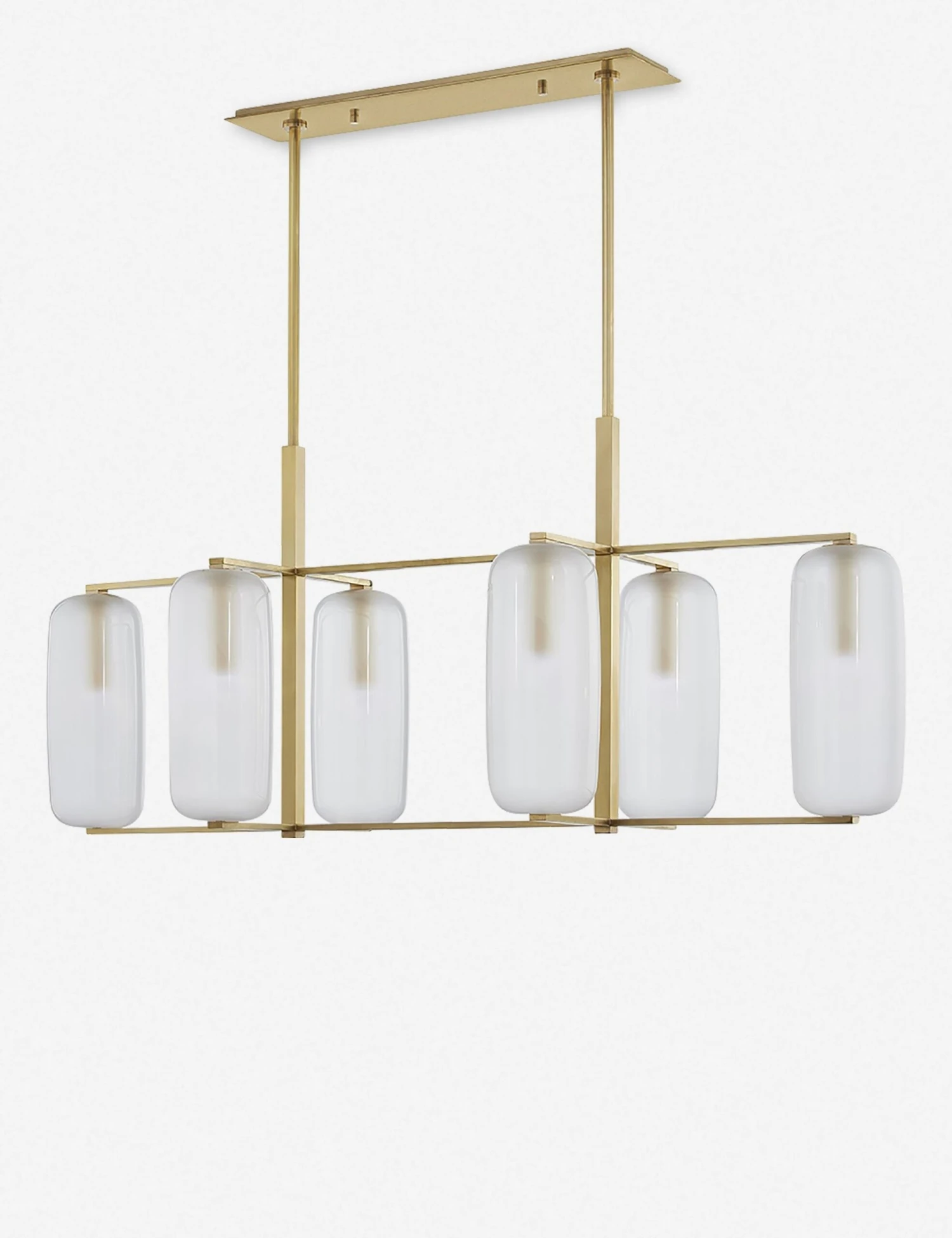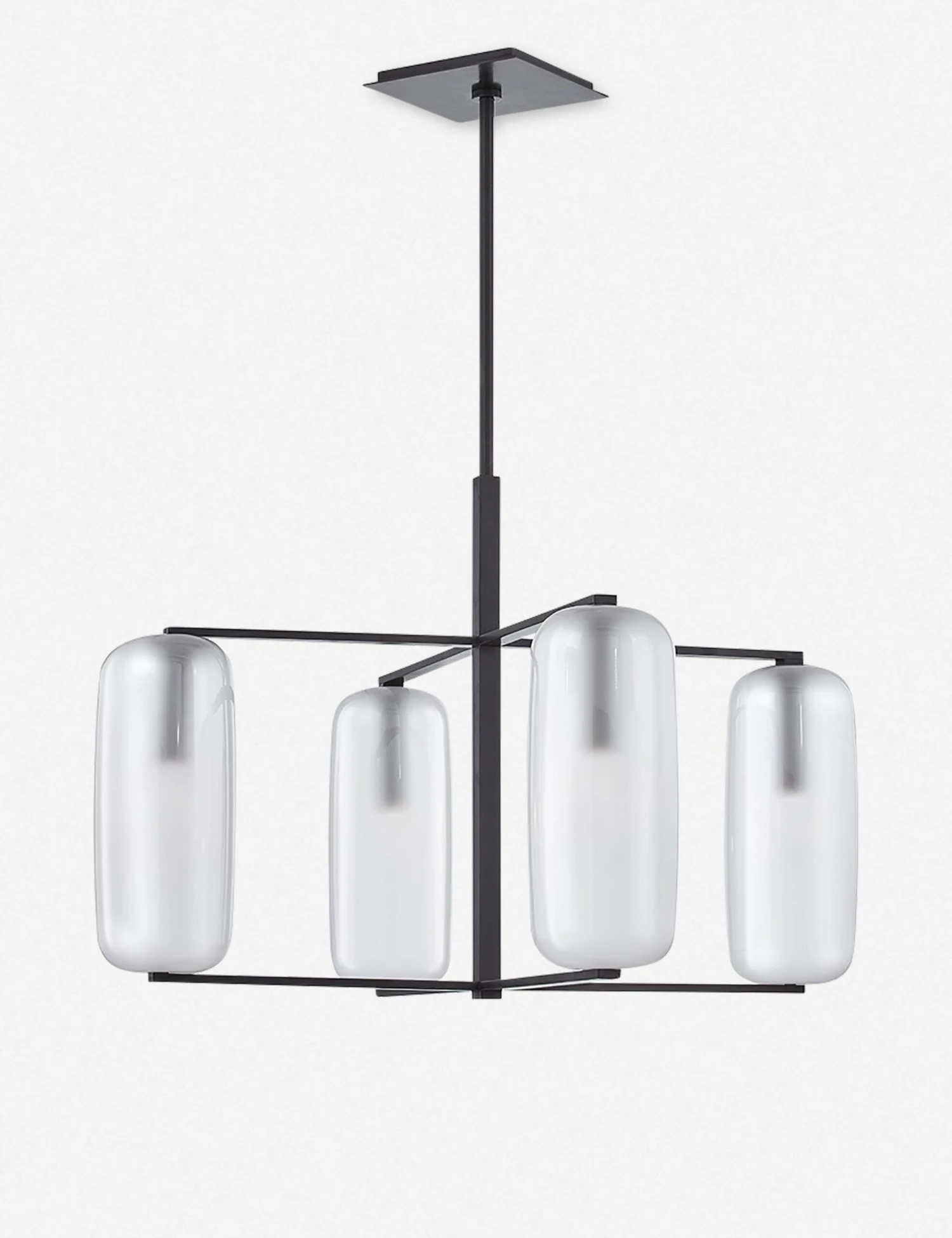A perfectly transitional style for mid-century spaces. Four pill-shaped frosted glass shades recalls ’60s influence, while crisp lines give the entire look a more modern appeal. Our stylists recommend hanging this pendant above dining room tables, kitchen islands, or in entryways.