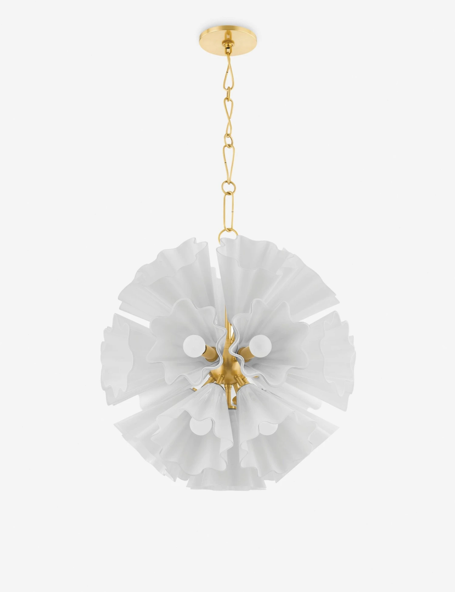Make a statement in light. The Palencia chandelier features ruffled opal glass shades radiating from a brass-finished globe in a stunning floral display. This modern chandelier will fill the room with artful brilliance and a warm glow.