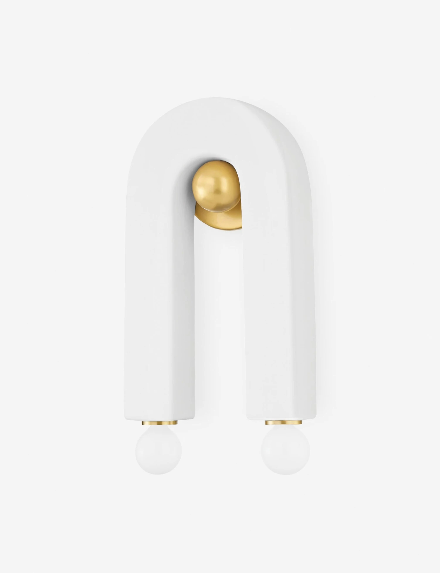 The Saima Sconce is a room-redefining accent that instantly grabs your attention. This sconce emanates soft light from two bulbs at the end of a ceramic arch remarkably balanced on a rounded brass base to create a stunning piece of wall art for your living space.